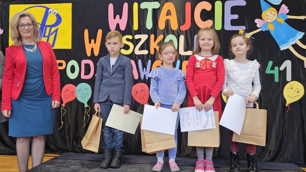 19 stycznia w naszej szkole odbyła się uroczysta Gala Laureatów w konkursach: „Suknia Pani Zimy”, „Baśniowa zakładka” oraz w IX Powiatowym Konkursie Przyrodniczym „Zimowe zjawiska przyrodnicze” i w VII Powiatowym Konkursie Informatycznym „Obraz. Zimowy krajobraz”. Adresatami konkursów byli uczniowie klas 1-3 i przedszkolaki. Wyróżnionym dzieciom dyplomy i nagrody wręczyła p. Joanna Woźniak – dyrektor Szkoła Podstawowa nr 41 im. Jana Matejki w Częstochowie oraz organizatorki konkursów: p. Katarzyna Malanowska, p. Katarzyna Pindych i p. Agnieszka Głowacka.